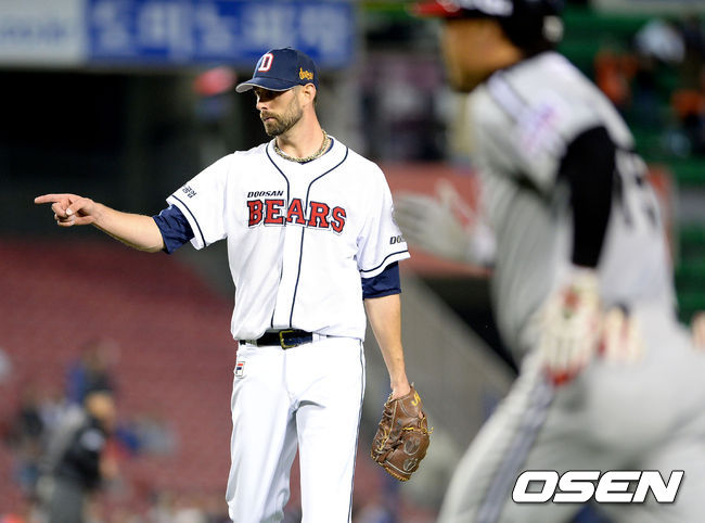 3회초 수비를 마친 두산 니퍼트가 양의지에 격려의 손짓을 보내고 있다.