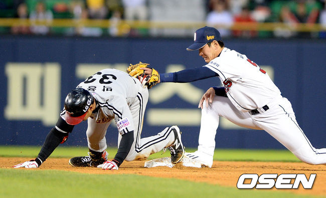 3회초 2사에서 LG 박용택이 2루타를 날리고 두산 김재호의 태그에 앞서 세이프되고 있다.