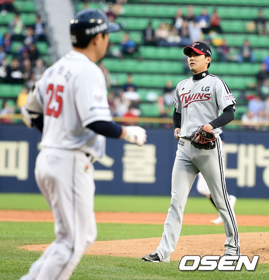 1회말 1사 만루에서 LG 임정우가 두산 양의지에 밀어내기 볼넷을 허용하며 실점을 하고 있다.