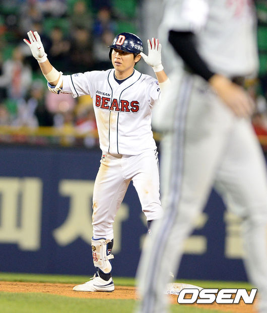 5회말 1사에서 두산 정수빈이 2루타를 날리고 타임을 외치고 있다.