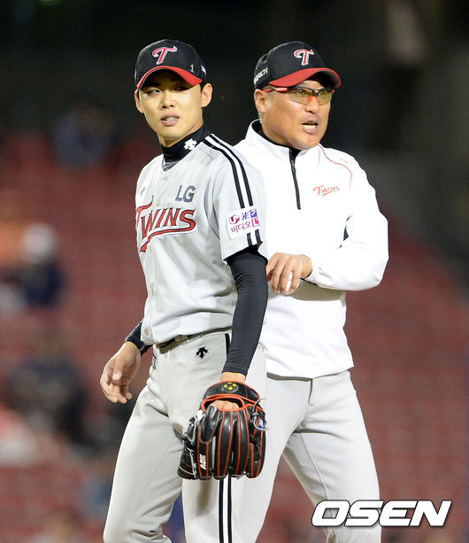 5회말 2사 1,3루에서 LG 강상수 코치가 마운드에 올라 임정우와 이야기를 나누고 있다.