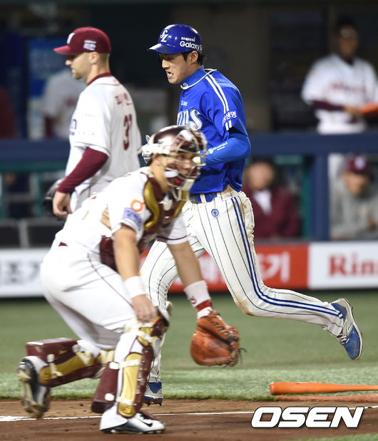 6회초 무사 3루 삼성 구자욱이 이지영의 희생 플라이때 득점을 올리고 있다.