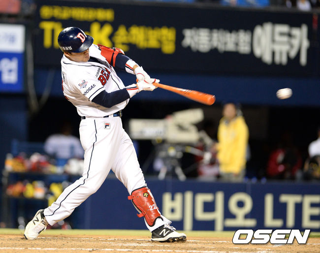 5회말 2사 만루에서 두산 홍성흔이 2타점 적시타를 날리고 있다.