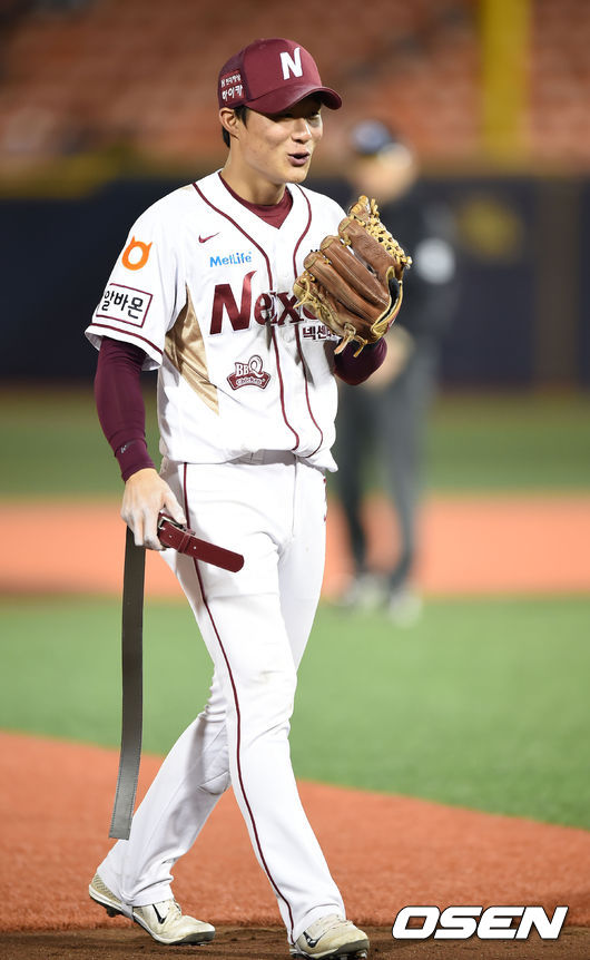 7회초 넥센 김하성이 수비도중 허리 벨트가 끊어져 교체하고 있다.