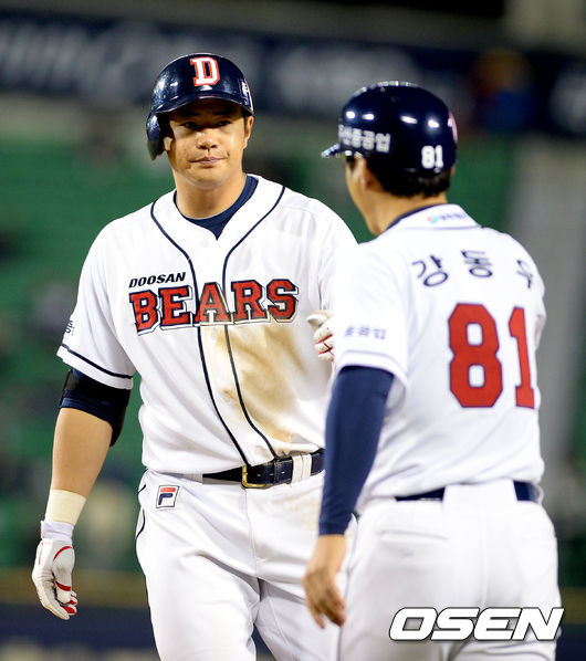 5회말 2사 1,3루에서 두산 김재환이 1타점 적시타를 날리며 강동우 코치와 기뻐하고 있다.