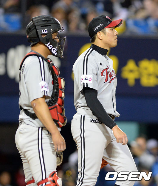 5회말 2사 1,3루에서 LG 유원상이 두산 김재환에 1타점 적시타를 허용하며 아쉬워하고 있다.