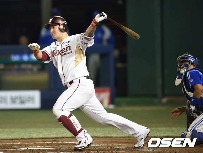 7회말 무사 1,2루 넥센 박병호가 1타점 적시타를 때리고 있다.