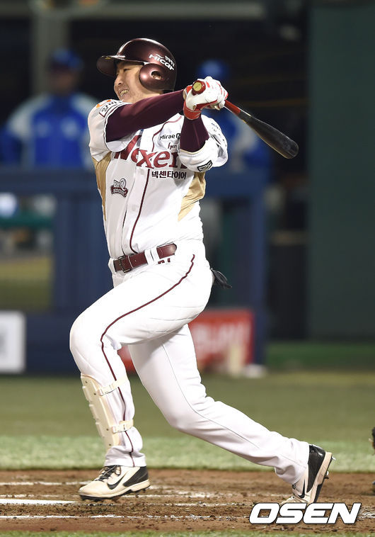 7회말 무사 2,3루 넥센 유한준이 2타점 적시타를 때리고 있다.