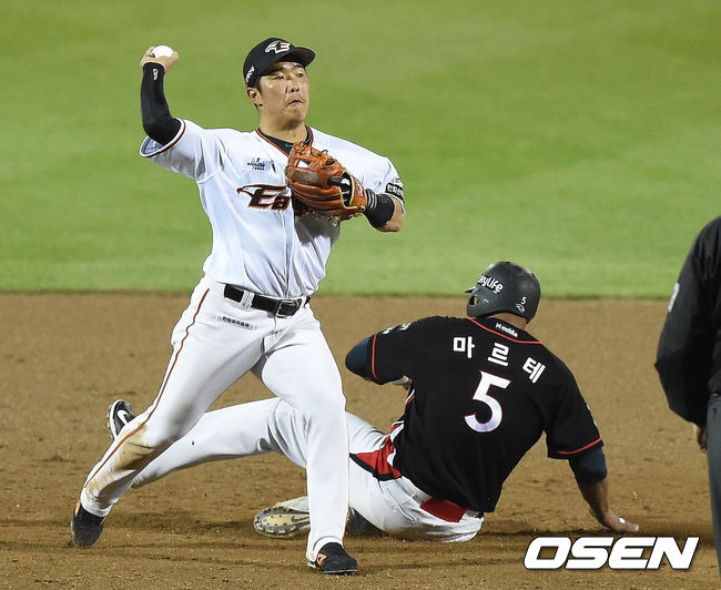 6일 오후 대전 한화생명 이글스 파크에서 열린 '2015 타이어뱅크 KBO 리그' 한화 이글스와 kt 위즈의 경기 6회초 무사 1루 김상현의 3루수 앞 땅볼을 정근우가 2루에서 마르테를 포스아웃 시키고 1루로 송구하고 있다. 김상현은 1루에서 세이프.
