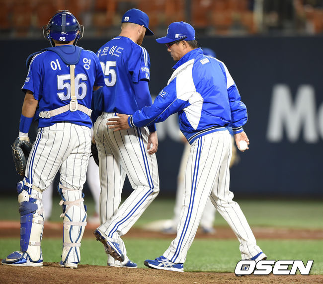 7회말 무사 1루 삼성 클로이드가 넥센 유한준에게 2타점 적시타를 허용한 뒤 강판되고 있다.