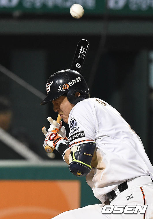 6일 오후 대전 한화생명 이글스 파크에서 열린 '2015 타이어뱅크 KBO 리그' 한화 이글스와 kt 위즈의 경기 6회말 무사 1루 김회성이 옥스프링의 투구에 몸을 맞고 있다.