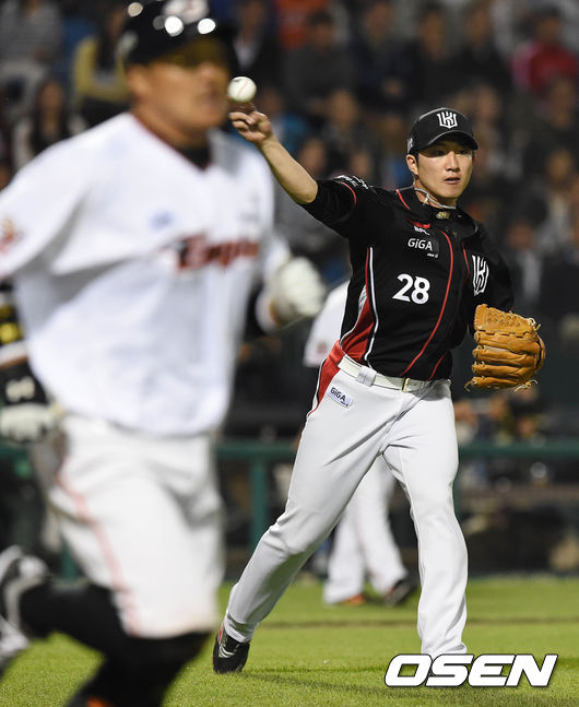 6일 오후 대전 한화생명 이글스 파크에서 열린 '2015 타이어뱅크 KBO 리그' 한화 이글스와 kt 위즈의 경기 6회말 1사 2,3루 조인성의 땅볼을 잡은 장시환이 1루로 송구하고 있다.