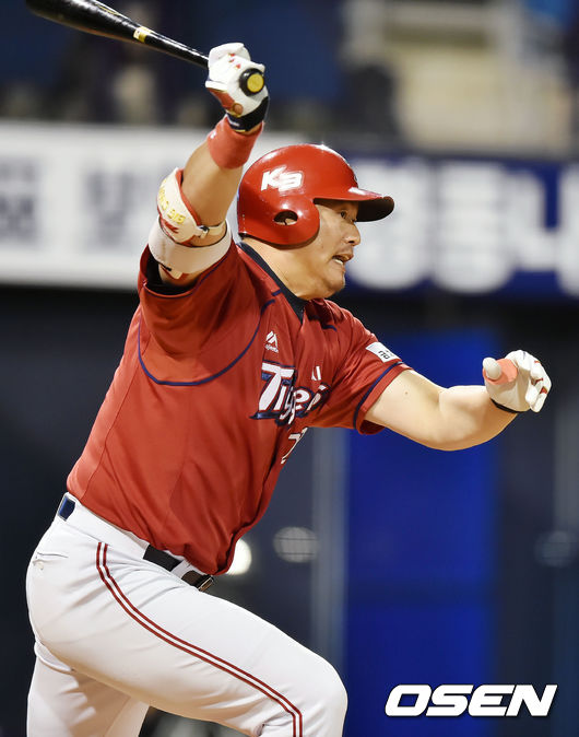 6일 오후 창원시 마산 야구장서 열린 '2015 타이어뱅크 KBO 리그' NC 다이노스와 KIA 타이거즈의 경기, 7회초 1사 주자 1,2루 KIA 최희섭이 우익수 앞 1타점 적시타를 날리고 있다.