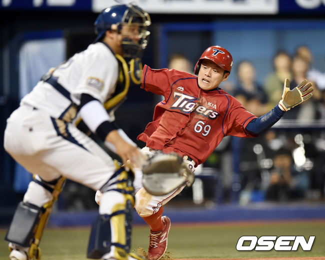 6일 오후 창원시 마산 야구장서 열린 '2015 타이어뱅크 KBO 리그' NC 다이노스와 KIA 타이거즈의 경기, 7회초 1사 주자 1,2루 KIA 최희섭이 우익수 앞 1타점 적시타때 2루 주자 이은총이 몸을 날려 홈에서 세이프 되고 있다.