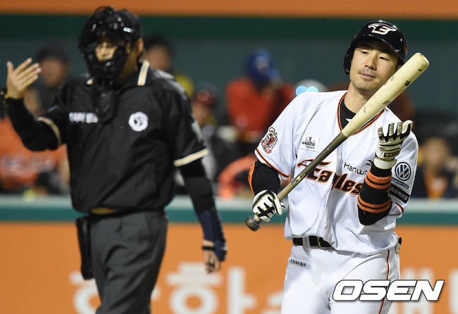 6일 오후 대전 한화생명 이글스 파크에서 열린 '2015 타이어뱅크 KBO 리그' 한화 이글스와 kt 위즈의 경기 6회말 2사 2,3루 대타 한상훈이 삼진을 당하고 덕아웃으로 향하고 있다.