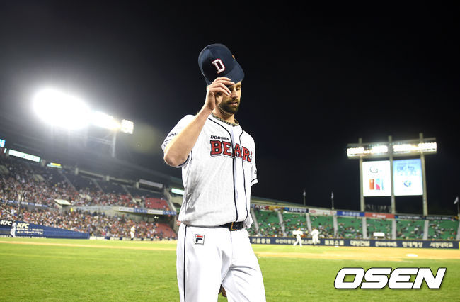 6회초 수비를 마치고 두산 니퍼트가 더그아웃으로 향하고 있다.