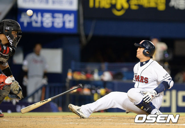 7회말 1사 1루에서 두산 최재훈이 LG 신재웅의 투구에 맞고 괴로워하고 있다.