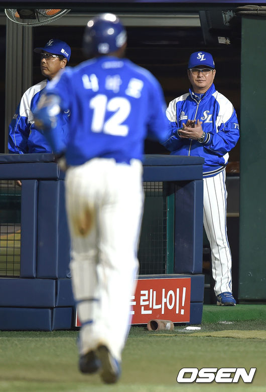 삼성 류중일 감독이 9회초 2사 솔로 홈런을 때린 나바로를 향해 박수를 치고 있다.