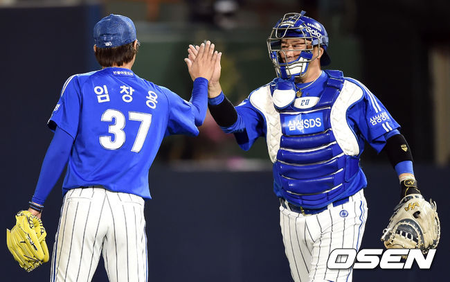 승리를 거둔 삼성 임창용과 진갑용이 하이파이브를 하고 있다. / youngrae@osen.co.kr