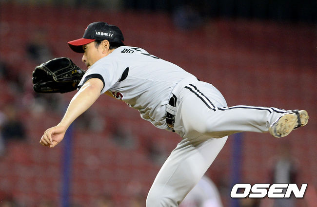 8회말 2사에서 LG 봉중근이 마운드에 올라 역투하고 있다.