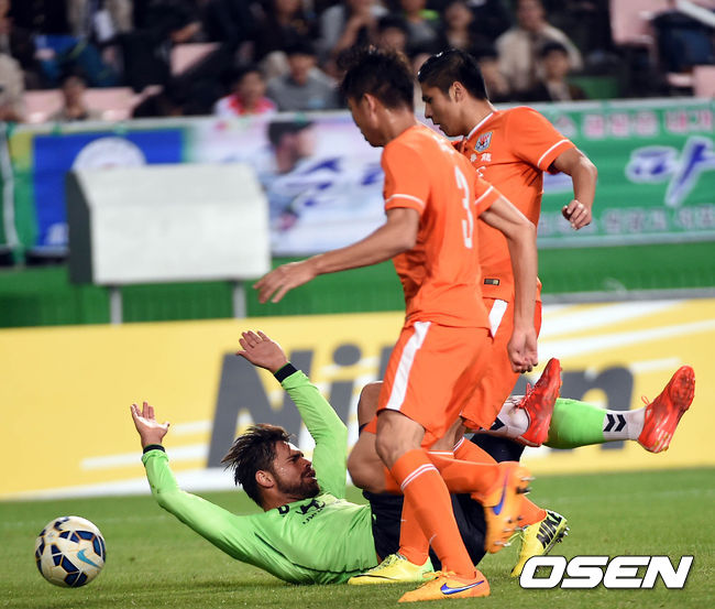 후반 전북 에두가 산둥의 골문 앞에서 파울을 당해 PK를 얻어내고 있다./greenfield@osen.co.kr