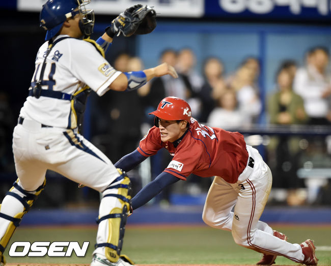 6일 오후 창원시 마산 야구장서 열린 '2015 타이어뱅크 KBO 리그' NC 다이노스와 KIA 타이거즈의 경기, 9회초 1사 주자 3루 KIA 오준혁의 좌익수 희생플라이때 3루 주자 강한울이 홈으로 몸을 던져 세이프가 되고 있다.