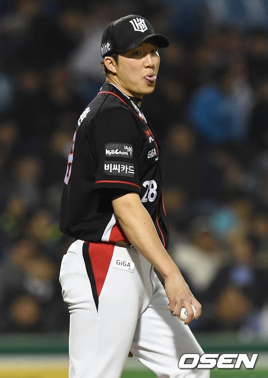 6일 오후 대전 한화생명 이글스 파크에서 열린 '2015 타이어뱅크 KBO 리그' 한화 이글스와 kt 위즈의 경기 9회말 1사 1루 한상훈을 삼진으로 처리한 장시환이 혀를 내밀고 있다.