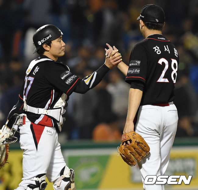6일 오후 대전 한화생명 이글스 파크에서 열린 '2015 타이어뱅크 KBO 리그' 한화 이글스와 kt 위즈의 경기 종료 후 장시환과 용덕한이 하이파이브를 하고 있다.