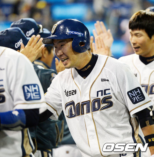 9회말 무사 만루 NC 지석훈이 끝내기 안타를 날린 후 코치진들과 하이파이브를 하고 있다./ rumi@osen.co.kr