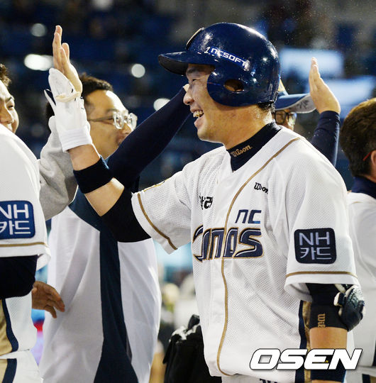 9회말 무사 만루 NC 지석훈이 끝내기 안타를 날린 후 코치진들과 하이파이브 하며 기뻐하고 있다./ rumi@osen.co.kr