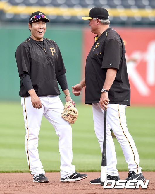 강정호-PIT 허들 감독,'훈훈한 대화'
