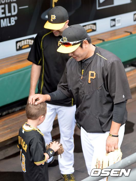 7일(한국시간) 미국 펜실베니아주 PNC파크에서 열리는 '2015 메이저리그' 피츠버그 파이어리츠와 신시내티 레즈의 경기를 앞두고, 피츠버그 강정호가 주전 2루수 닐 워커의 아들과 인사를 나누고 있다.