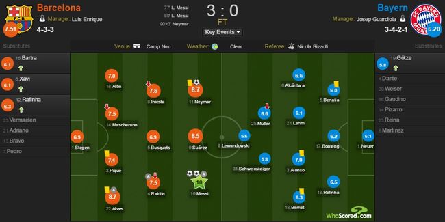 물론 바르셀로나는 메시 뿐만 아니라 다니 알베스, 네이마르, 루이스 수아레스 등 모두 위력적인 모습을 보였다. 상대에게 실점하지 않기 위해 철저하게 수비적인 모습을 보인 뮌헨에 비해 훨씬 앞선 모습이었다.