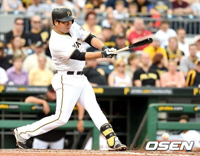 2회말 피츠버그 공격 2사 주자없는 상황 강정호가 내야안타를 날리고 있다.