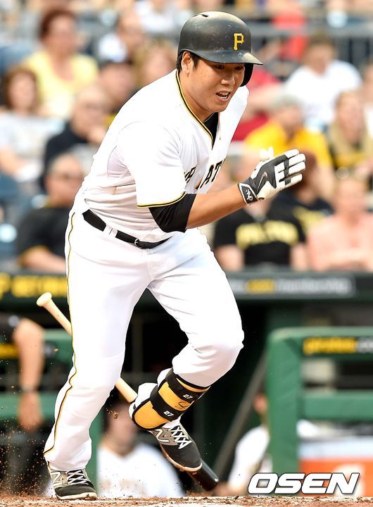 2회말 피츠버그 공격 2사 주자없는 상황 강정호가 내야안타를 날리고 1루로 전력질주 하고 있다.