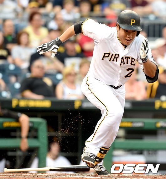 2회말 피츠버그 공격 2사 주자없는 상황 강정호가 내야안타를 날리고 1루로 전력질주 하고 있다.
