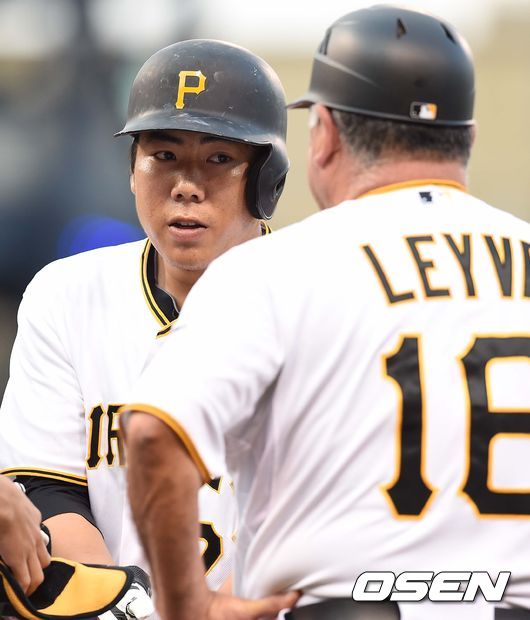 2회말 피츠버그 공격 2사 주자없는 상황 강정호가 내야안타를 날리고 1루에 안착해 코치와 인사를 나누고 있다.