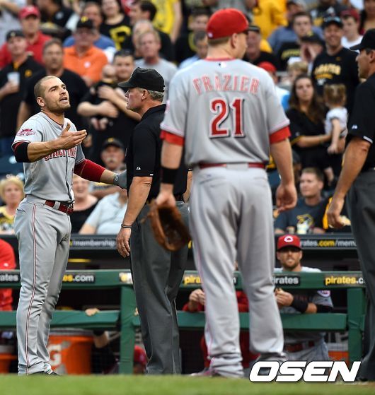 3회초 신시내티 공격 2사 주자없는 상황 피츠버그 선발 개릿 콜에게 삼진을 당한 조이 보토가 심판진에게 어필하고 있다.