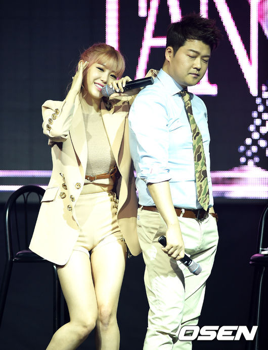 전효성이 사회를 맡은 방송인 전현무와 포인트 안무를 선보이고 있다.