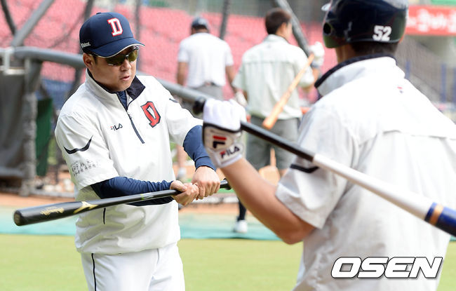 7일 오후 서울 잠실야구장에서 열린 '2015 타이어뱅크 KBO 리그' 두산 베어스와 LG 트윈스의 경기, 경기시작전 두산 김태형 감독이 김재호와 이야기를 나누고 있다.