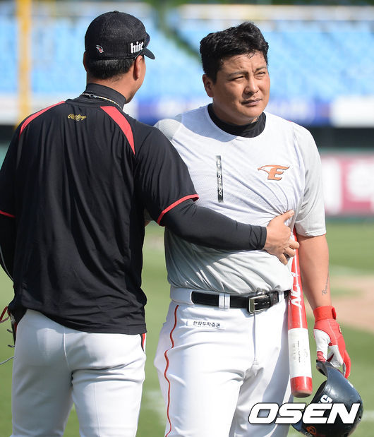 7일 오후 대전 한화생명 이글스 파크에서 열리는 '2015 타이어뱅크 KBO 리그' 한화 이글스와 kt 위즈의 경기 시작전 김상현과 김태균이 인사를 나누고 있다.