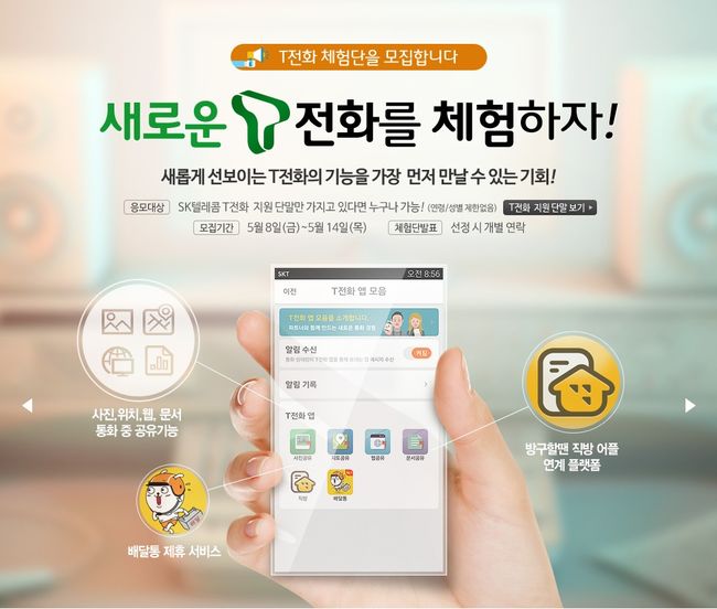 ‘T전화’ 체험단 모집 인원은 30명이며, 모집 기간은 오는 8일부터 14일까지로 SK텔레콤 가입자 중 ‘T전화’ 지원 단말을 가지고 있다면 연령, 성별에 제한없이 누구나 응모할 수 있다.