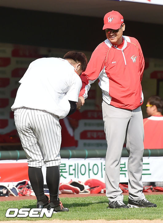 7일 오후 부산 사직구장서 '2015 타이어뱅크 KBO 리그' 롯데 자이언츠와 SK 와이번스의 경기가 열릴 예정인 가운데 양 팀 훈련시간에 SK 김용희 감독이 롯데 강민호와 악수를 나누며 얘기를 나누고 있다.