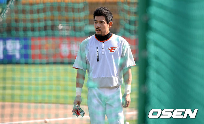 7일 오후 대전 한화생명 이글스 파크에서 열리는 '2015 타이어뱅크 KBO 리그' 한화 이글스와 kt 위즈의 경기 시작전 이용규가 동료들의 훈련 모습을 지켜보고 있다.