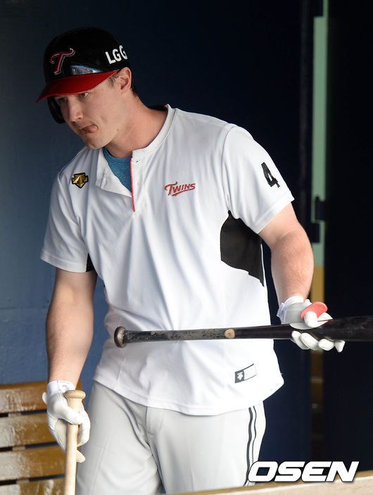 7일 오후 서울 잠실야구장에서 열린 '2015 타이어뱅크 KBO 리그' 두산 베어스와 LG 트윈스의 경기, 경기시작전 시즌 첫 1군에 등록된 LG 한나한이 훈련에 임하고 있다.