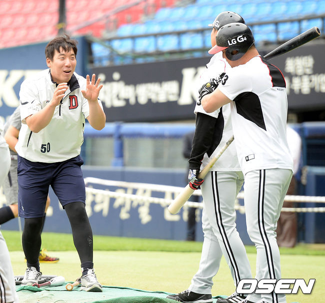 7일 오후 서울 잠실야구장에서 열린 '2015 타이어뱅크 KBO 리그' 두산 베어스와 LG 트윈스의 경기, 두산 김현수와 LG 이진영이 이야기를 나누고 있다.