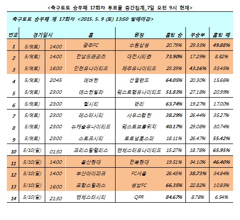 이 밖에도 전남이 대전을 상대로 승리할 것이란 예상이 무려 73.90%로 높게 집계됐고, 인천-제주간의 경기에서는 두 팀이 박빙 승부를 벌일 것(43.16%)이란 예상이 많았다. 축구토토 승무패 17회차 게임은 9일 오후 1시 50분에 발매가 마감되며, 상세한 일정은 공식 인터넷 발매사이트 베트맨에서 일정을 확인할 수 있다.