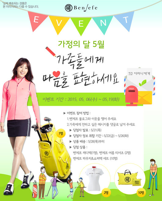벤제프 가정의 달 이벤트는 5월 19일까지 벤제프 공식 페이스북(https://www.facebook.com/benjefegolf)과 블로그(http://blog.naver.com/benjefe)를 통해서, 진행되며 벤제프 페이스북 ‘좋아요’를 누르거나, 블로그와 ‘이웃’을 맺고 가족에게 감사의 메시지를 댓글로 남기면 참여할 수 있다.
