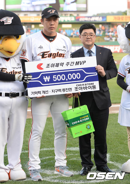 7일 오후 대전 한화생명 이글스 파크에서 열린 '2015 타이어뱅크 KBO 리그' 한화 이글스와 kt 위즈의 경기 시작전 조아제약 주간 MVP에 선정된 권혁이 조아제약 대전영업소 권오헌 소장과 기념촬영을 갖고 있다.
