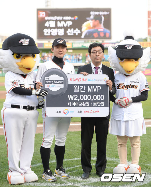 2015년 KBO 리그 타이틀 스폰서인 타이어뱅크(회장 김정규)가 후원하고 KBO가 시상하는 '2015 타이어뱅크 KBO 리그 4월 MVP'에 한화 투수 안영명이 선정됐다. 안영명은 지난 4일 치러진 KBO 리그 출입기자단 투표에서 유효 표 28표 가운데 22표(78.6%)를 획득하며 다른 후보들을 압도적인 표 차이로 제치고 2015년 첫 월간 MVP의 영광을 안았다.